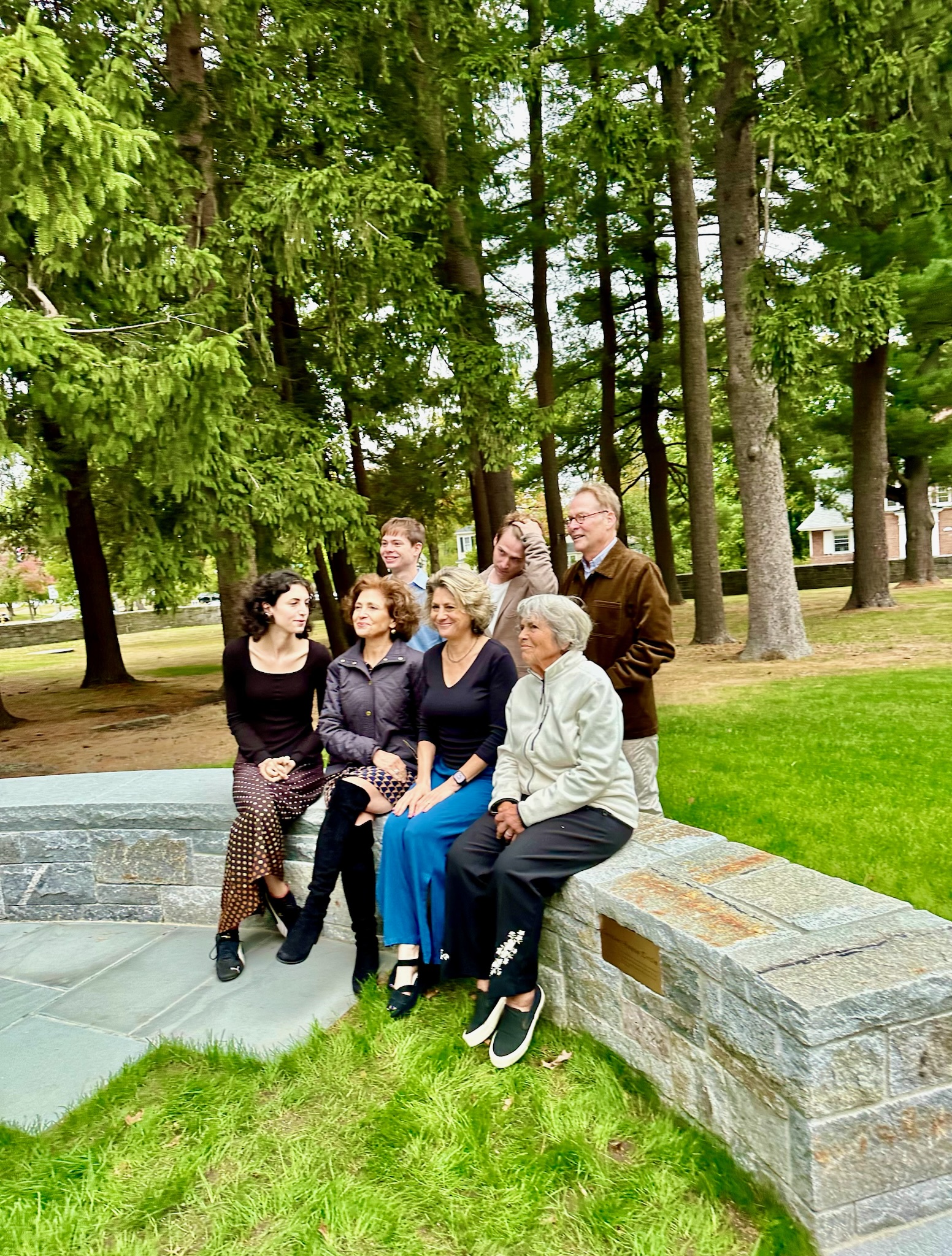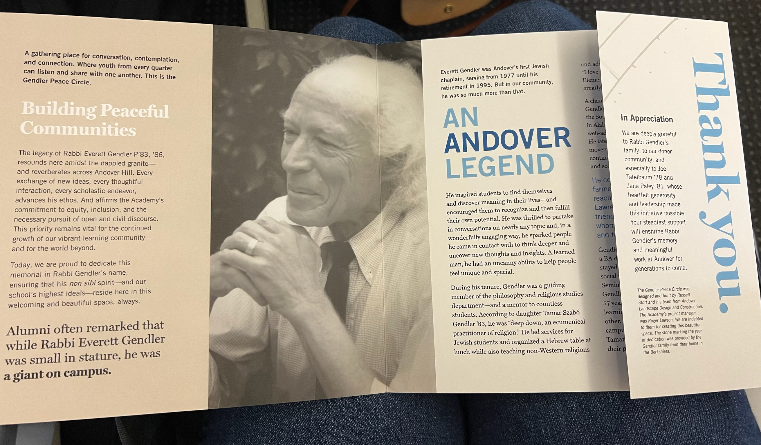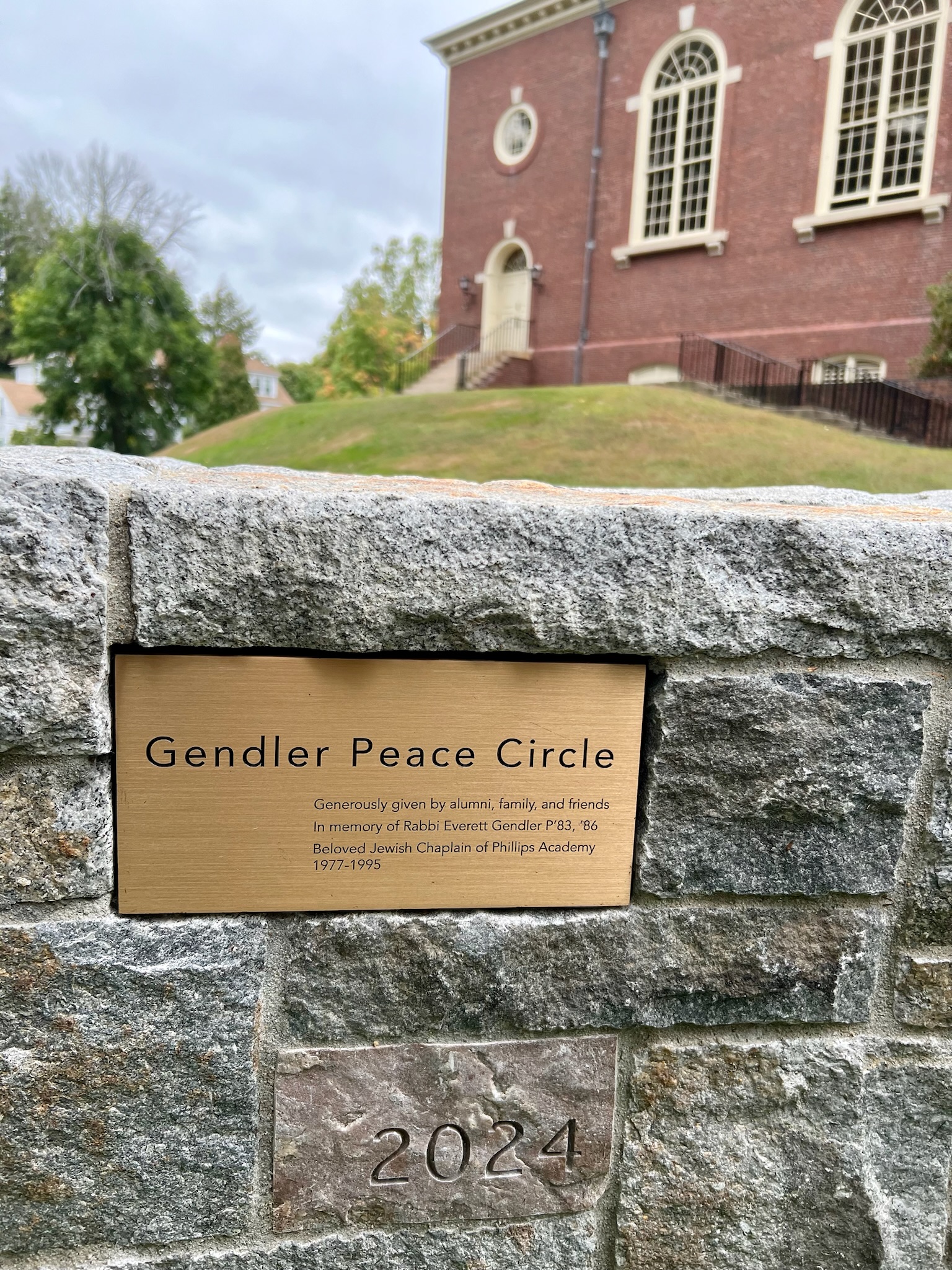On September 20, 2024, friends and family of Rabbi Everett Gendler gathered together at Phillips Academy in Andover, Massachusetts — where Everett served as the school’s first Jewish Chaplain from 1977 to 1995 — for the dedication of the Gendler Peace Circle. Following Rabbi Gendler’s death on April 1, 2022, former Andover students Joe Tatelbaum and Jana Paley began talking about a way they could honor the memory of their beloved rabbi and teacher, together with his wife of 58 years, Mary. They sketched out an outdoor space that could be used as a place of reflection, meditation, learning, socializing, and contemplation. When they proposed their idea to Andover leadership, they were met with enthusiasm and support — and alumni, colleagues, and other community members eagerly advanced the project, which has taken the form of an outdoor functional sculpture in a pine grove beside Cochran Chapel, underneath Everett’s former second-story office window. The Academy leadership, including Head of School Dr. Raynard Kington and Secretary of the Academy Thom Lockerbee, helped to lead a beautiful dedication ceremony, which also included remarks from (among others) current Jewish Chaplain Rabbi Joshua Greenberg and Everett’s daughter Tamar Szabó Gendler. This collective desire to name a space in Everett’s honor reflects what we all know about him — he touched the lives of those with whom he worked and interacted. The Gendler Peace Circle is visually beautiful, organically inspired, and will be used in practical application. For those who knew Everett, that’s an important and fitting combination.